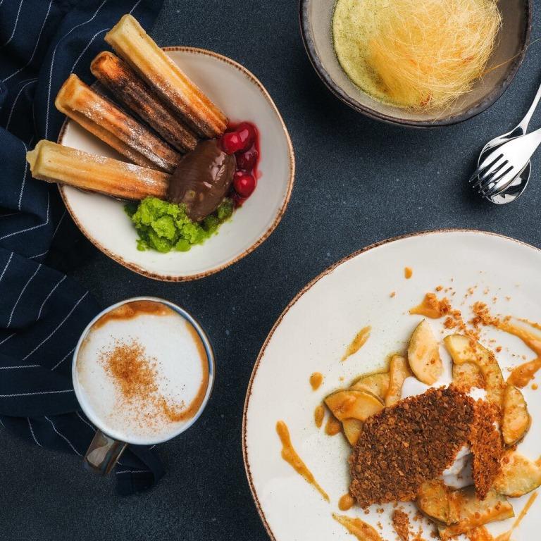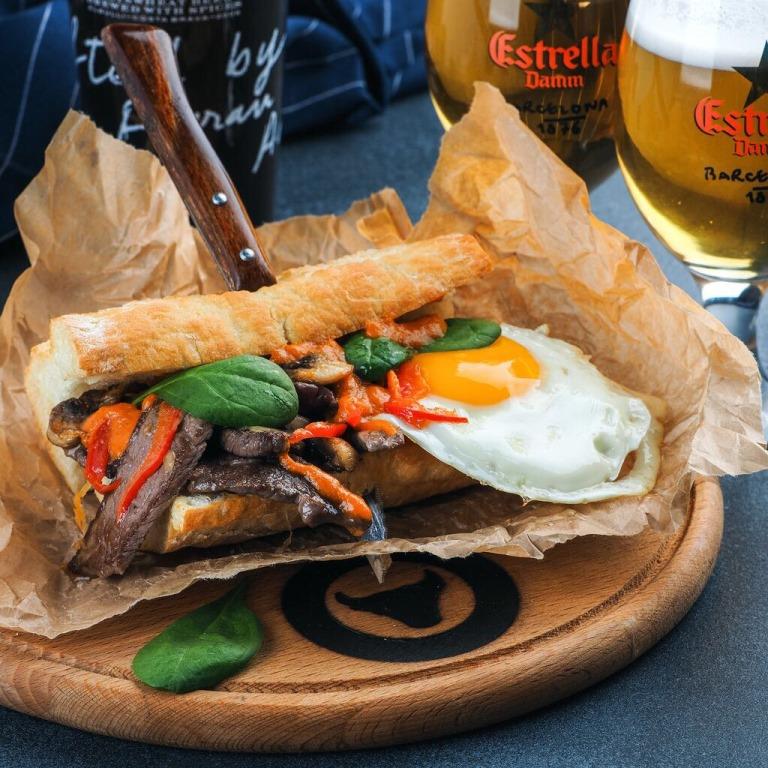 Пучеро – испанская солянка, мы кладем в нее свиные ребра и нут, говядину и пинчо с куриным паштетом. Бокадильос – горячий испанский сэндвич с принципиальным отличием от многих других бутербродов – начинка для него готовится на одной сковороде, так что вкусы пропитываются и начинают дружить; у нас четыре вида бокадильос, с копченой курицей, острый – со свининой и халапеньо, с говядиной, шпинатом и яичницей и сырный – с руколой и жареными грибами. Испанская яичница – мы ее подаем с дегидрированным хамоном. Хамон предлагаем – с чоризо, с дыней или дынным желе или просто – хамон а натурель. На десерт – пончики чуррос с шоколадным ганашем и граните из эстрагона.