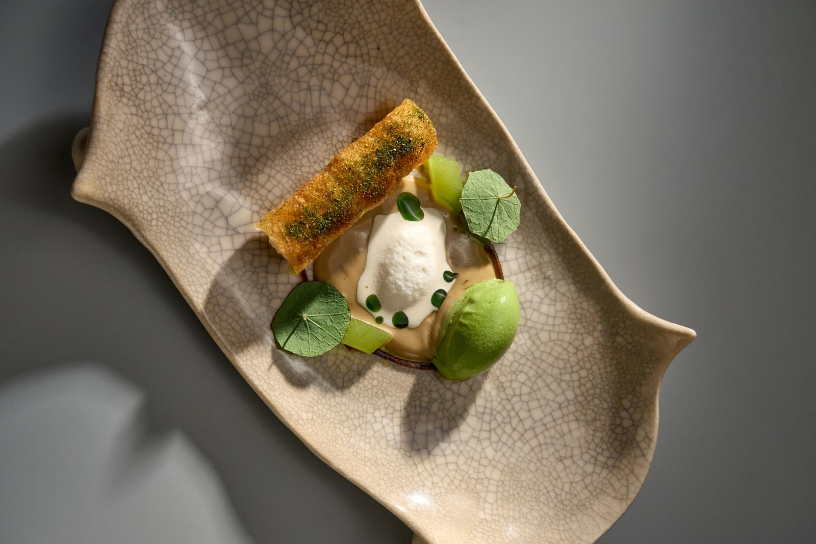 В качестве предесерта подают дыню с кокосовым муссом и травами. Основной десерт — ром-баба с миндальным мороженым. Завершают сет конфеты ручной работы.